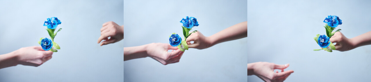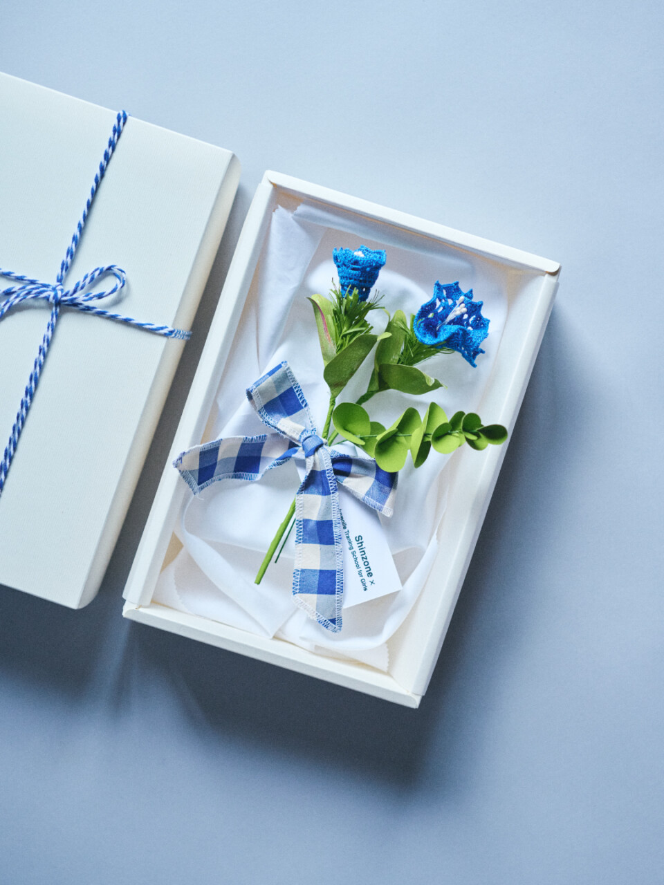 レースの繊細な透け感と、ペーパーのやわらかな質感。異なる素材が重なり合うことで、どこか凛とした存在感と、あたたかみを併せ持つ一輪に仕上がりました。お花は枯れることなく、時間とともに色褪せることもありません。 フラワーベースに挿して飾ったり、空間のアクセントとして取り入れたり、ギフトとしてもおすすめのアイテムです。ブルーの花に込められた「希望」「夢」「幸せ」という意味は、このプロジェクトの想いとも重なります。 ひとつとして同じ形のない、ハンドメイドならではの温度を宿したフラワーボックスです。
