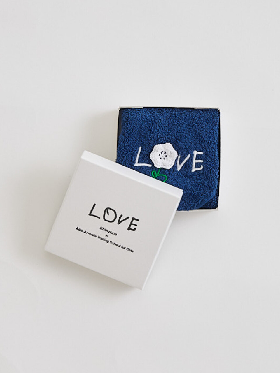 ギンガムポーチバッグと同様のクロッシェレースの小花モチーフをあしらったハンドタオル。刺繍で描いた「LOVE」のロゴの“O”に、白いレースを重ねました。 小さな花が、言葉にそっと寄り添うデザインです。「LOVE」という文字には、愛光女子学園の頭文字である“愛”、そして在院生たちの未来への愛と希望を込めました。